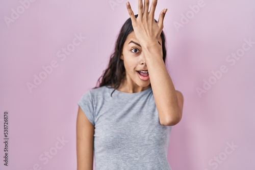 Young brazilian woman wearing casual t shirt over pink background surprised with hand on head for mistake, remember error. forgot, bad memory concept.