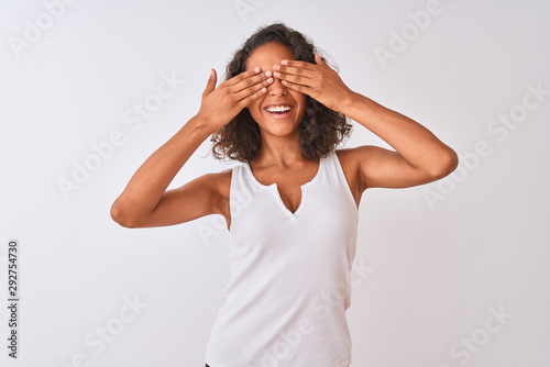Young brazilian woman wearing casual t-shirt standing over isolated white background covering eyes with hands smiling cheerful and funny. Blind concept.