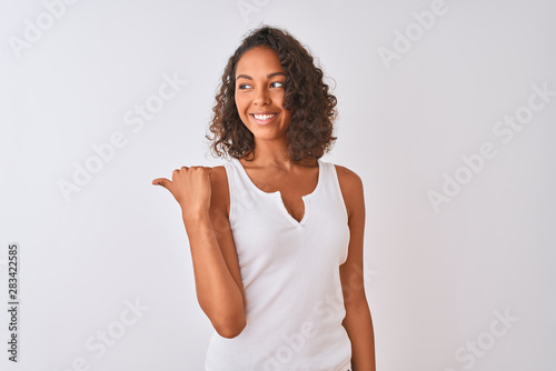 Young brazilian woman wearing casual t-shirt standing over isolated white background smiling with happy face looking and pointing to the side with thumb up.