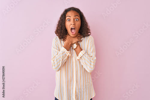 Young brazilian woman wearing striped shirt standing over isolated pink background shouting and suffocate because painful strangle. Health problem. Asphyxiate and suicide concept.