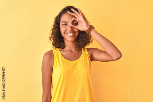 Young brazilian woman wearing t-shirt standing over isolated yellow background doing ok gesture with hand smiling, eye looking through fingers with happy face.