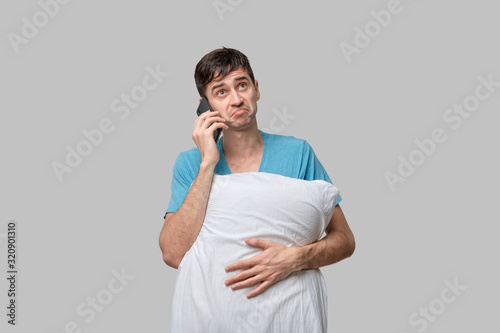 Young brunet man speaking on the phone hugging pillow and measuring temperature.
