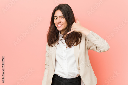Young brunette business woman against a pink background showing a mobile phone call gesture with fingers.