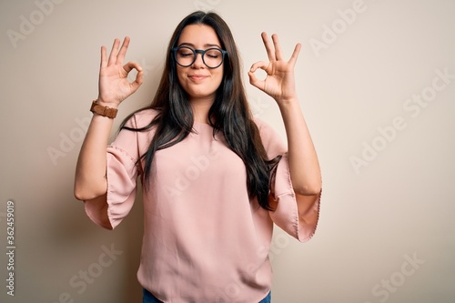Young brunette elegant woman wearing glasses over isolated background relax and smiling with eyes closed doing meditation gesture with fingers. Yoga concept.