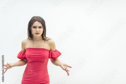 Young brunette female frowning because of bad news while standing over over white background throwing hands.