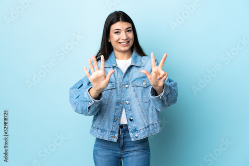 Young brunette girl over isolated blue background counting eight with fingers