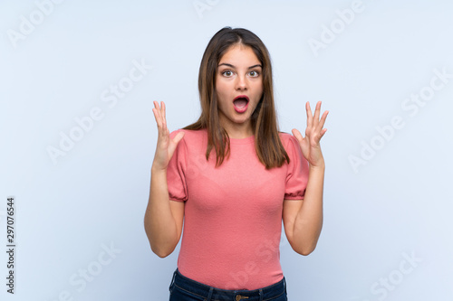 Young brunette girl over isolated blue background with surprise facial expression