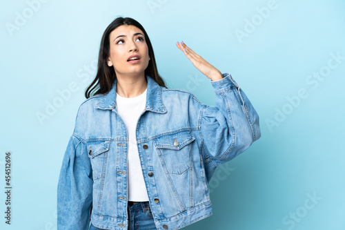 Young brunette girl over isolated blue background with tired and sick expression