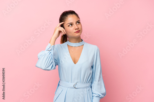 Young brunette girl over isolated pink background having doubts and with confuse face expression