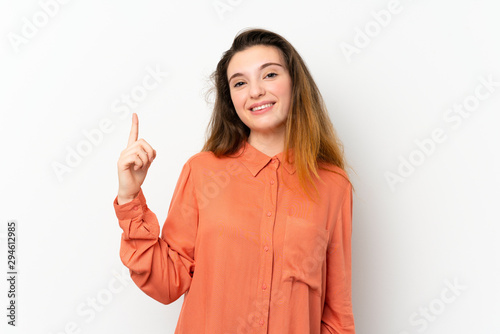 Young brunette girl over isolated white background showing and lifting a finger in sign of the best