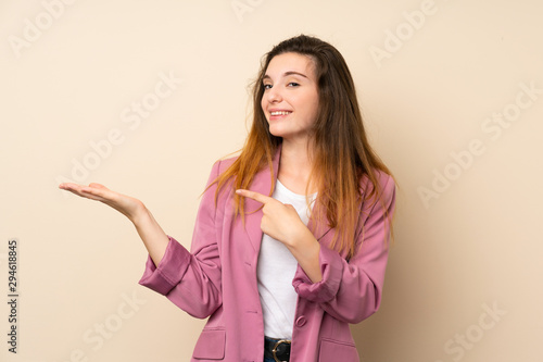 Young brunette girl with blazer over isolated background holding copyspace imaginary on the palm to insert an ad