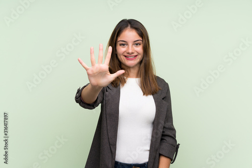 Young brunette girl with blazer over isolated green background counting five with fingers