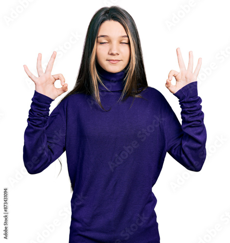 Young brunette girl with long hair wearing turtleneck sweater relax and smiling with eyes closed doing meditation gesture with fingers. yoga concept.