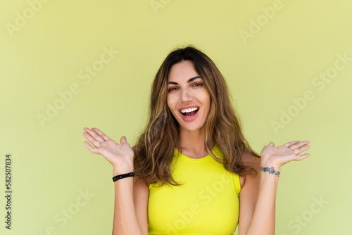 Young brunette in casual wear isolated on green background happy look to camera shocked amazed surprised open mouth