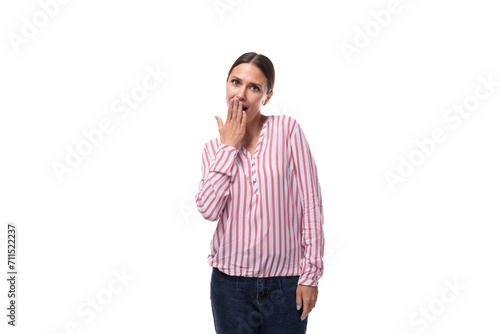 young brunette secretary woman with a ponytail hairstyle dressed in a striped blouse smiling on a white background