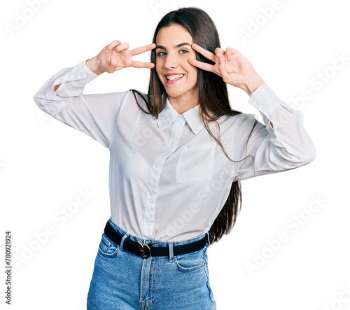 Young brunette teenager doing peace gesture close to eyes smiling with a happy and cool smile on face. showing teeth.