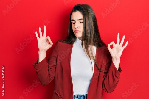 Young brunette teenager wearing business jacket relax and smiling with eyes closed doing meditation gesture with fingers. yoga concept.