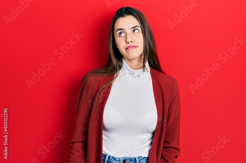 Young brunette teenager wearing business jacket smiling looking to the side and staring away thinking.