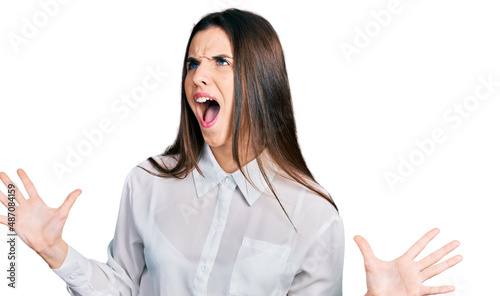 Young brunette teenager wearing business white shirt crazy and mad shouting and yelling with aggressive expression and arms raised. frustration concept.