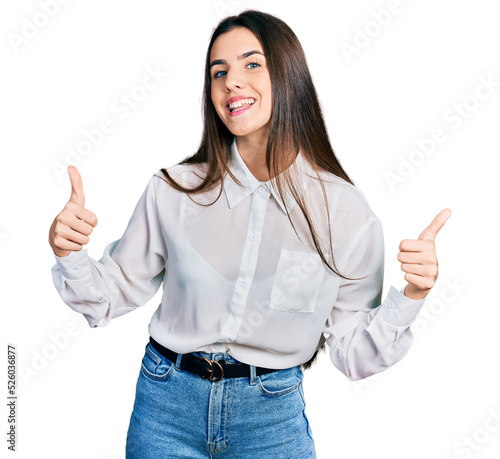 Young brunette teenager wearing business white shirt success sign doing positive gesture with hand, thumbs up smiling and happy. cheerful expression and winner gesture.