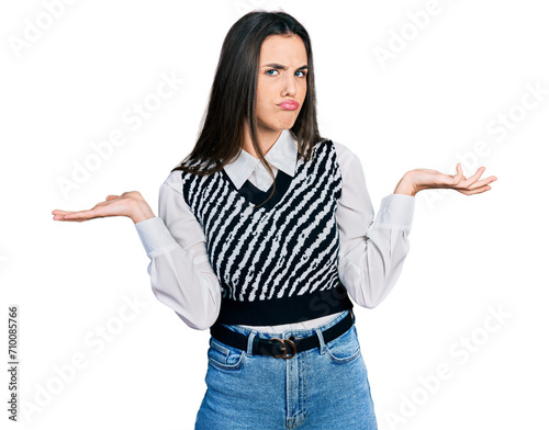 Young brunette teenager wearing casual elegant look clueless and confused with open arms, no idea and doubtful face.