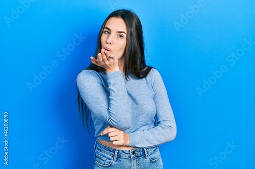 Young brunette teenager wearing casual sweater looking at the camera blowing a kiss with hand on air being lovely and sexy. love expression.