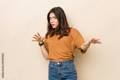 Young brunette woman against a beige background being shocked due to an imminent danger