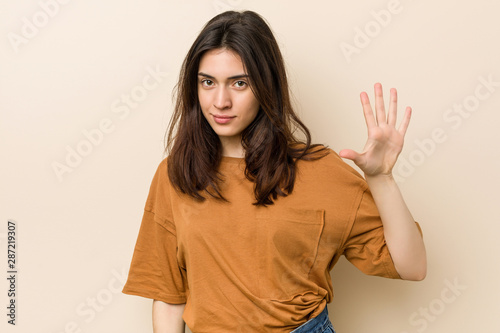 Young brunette woman against a beige background smiling cheerful showing number five with fingers.