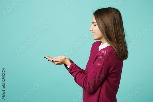 Young brunette woman girl in casual clothes posing isolated on blue wall background studio portrait. People emotions lifestyle concept. Mock up copy space. side profile view hold in palms something.