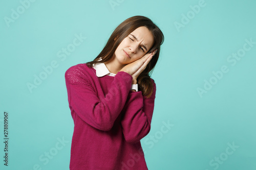 Young brunette woman girl in casual clothes posing isolated on blue wall background studio portrait. People sincere emotions lifestyle concept. Mock up copy space. sleep with folded hands under cheek.