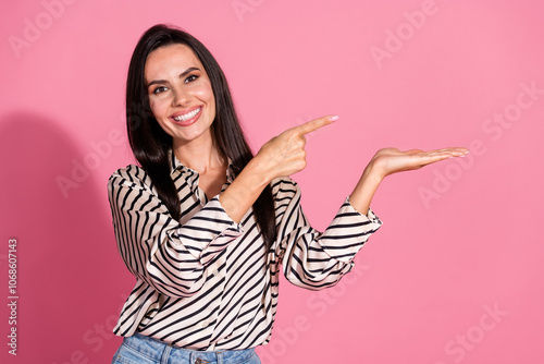 Young brunette woman in casual striped shirt smiling and pointing on pink background for advertising and promotions