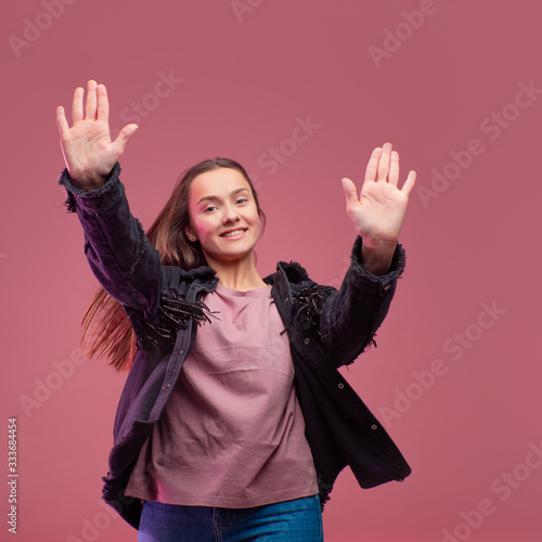 young brunette woman makes an informal greeting, pink background. Studio portrait,