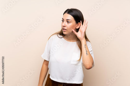 Young brunette woman over isolated background listening to something by putting hand on the ear