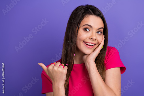 Young brunette woman smiling confidently in pink clothing on a vibrant purple background, showcasing happiness