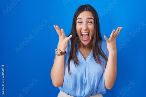 Young brunette woman standing over blue background celebrating mad and crazy for success with arms raised and closed eyes screaming excited. winner concept