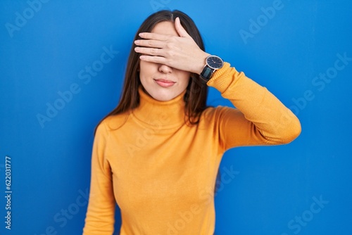 Young brunette woman standing over blue background covering eyes with hand, looking serious and sad. sightless, hiding and rejection concept