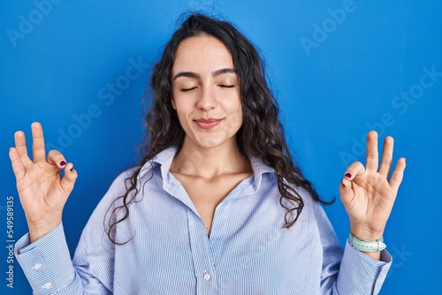 Young brunette woman standing over blue background relax and smiling with eyes closed doing meditation gesture with fingers. yoga concept.