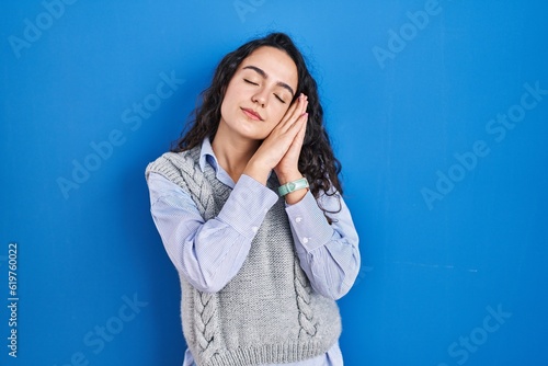 Young brunette woman standing over blue background sleeping tired dreaming and posing with hands together while smiling with closed eyes.