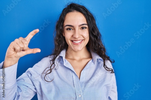 Young brunette woman standing over blue background smiling and confident gesturing with hand doing small size sign with fingers looking and the camera. measure concept.
