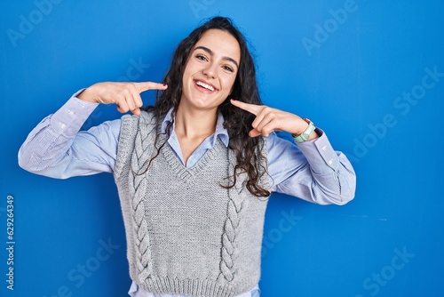 Young brunette woman standing over blue background smiling cheerful showing and pointing with fingers teeth and mouth. dental health concept.