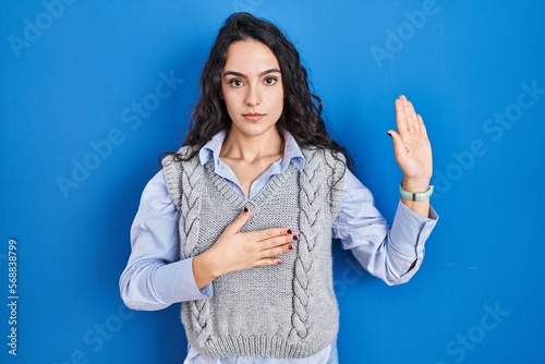 Young brunette woman standing over blue background swearing with hand on chest and open palm, making a loyalty promise oath