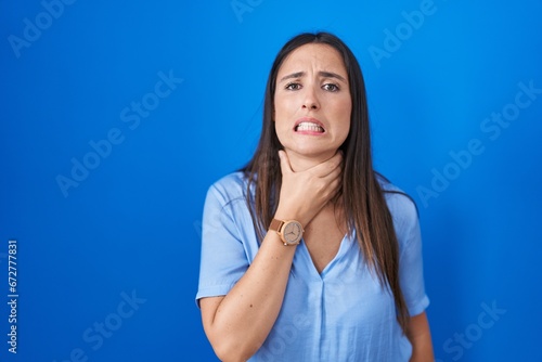 Young brunette woman standing over blue background touching painful neck, sore throat for flu, clod and infection