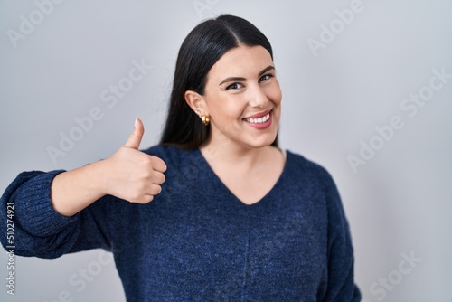 Young brunette woman standing over isolated background doing happy thumbs up gesture with hand. approving expression looking at the camera showing success.