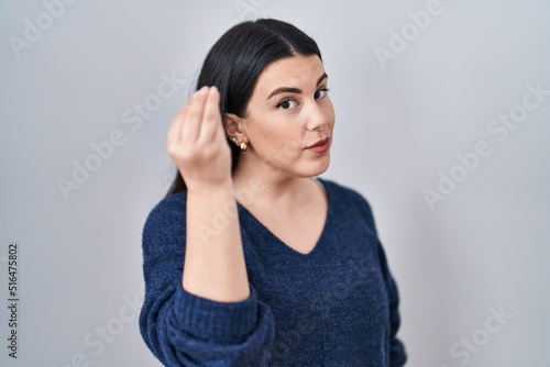 Young brunette woman standing over isolated background doing italian gesture with hand and fingers confident expression