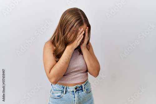 Young brunette woman standing over isolated background with sad expression covering face with hands while crying. depression concept.