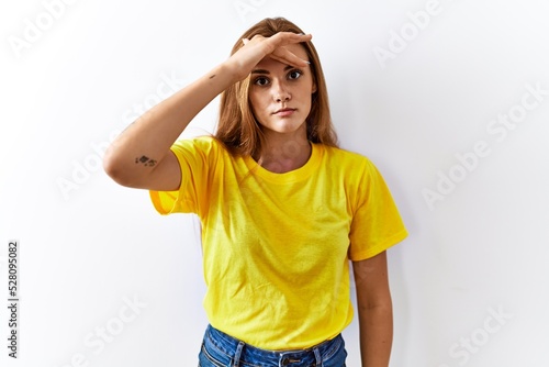 Young brunette woman standing over isolated background worried and stressed about a problem with hand on forehead, nervous and anxious for crisis