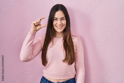 Young brunette woman standing over pink background smiling and confident gesturing with hand doing small size sign with fingers looking and the camera. measure concept.