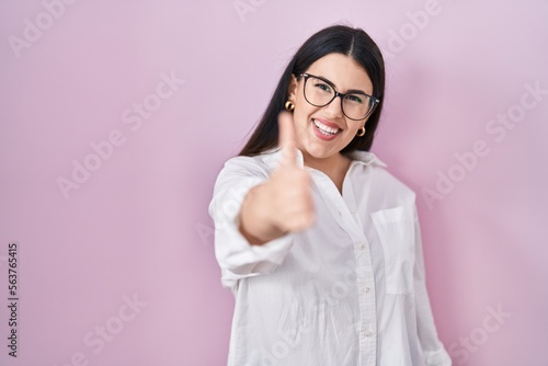 Young brunette woman standing over pink background smiling friendly offering handshake as greeting and welcoming. successful business.