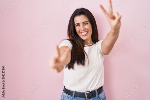Young brunette woman standing over pink background smiling with tongue out showing fingers of both hands doing victory sign. number two.