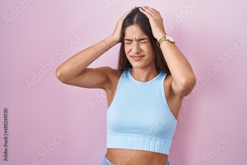 Young brunette woman standing over pink background suffering from headache desperate and stressed because pain and migraine. hands on head.